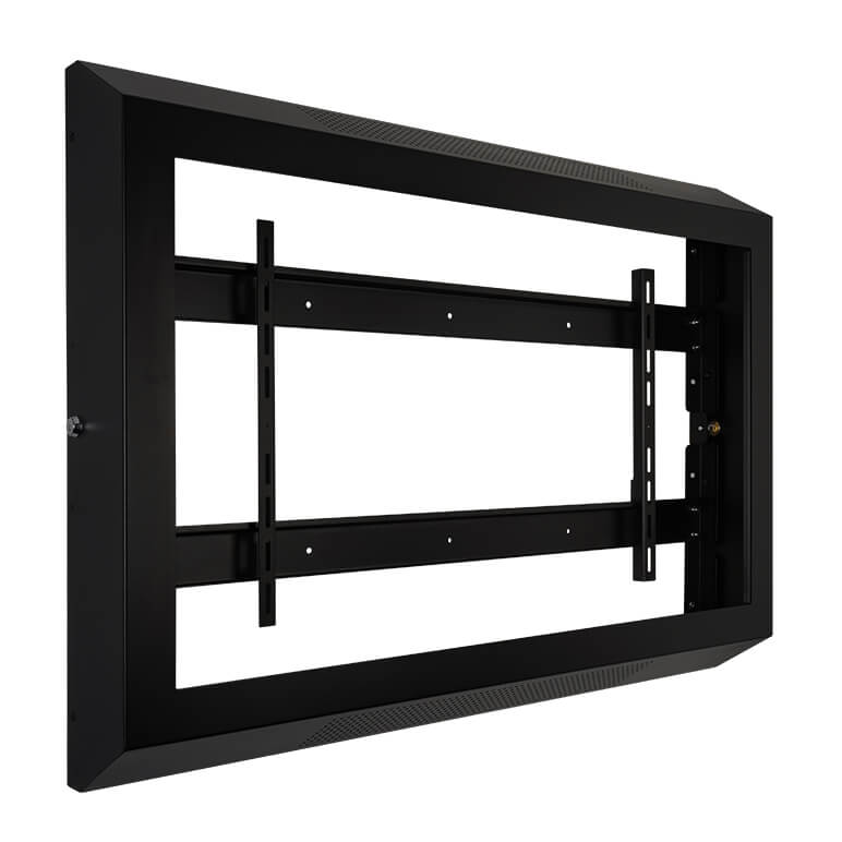 The TV Screen Protector accommodates a display in both landscape and portrait orientations. Each enclosure provides a secure and professional fit for most standard VESA mount displays. Designed for a flush installation with no rear access, it blends seamlessly into any indoor setting while maintaining easy cable access for upgrades.