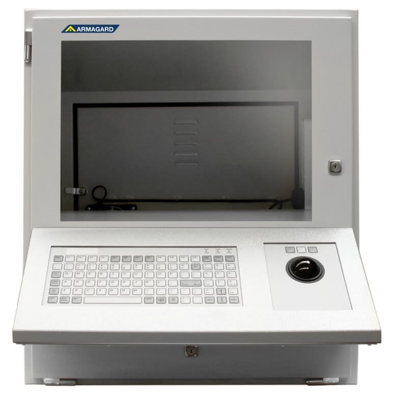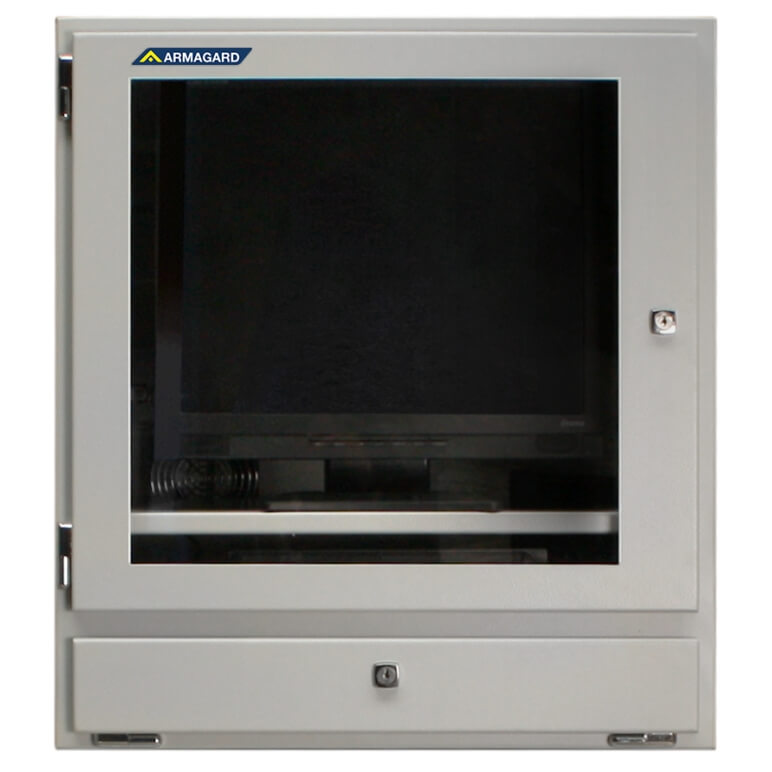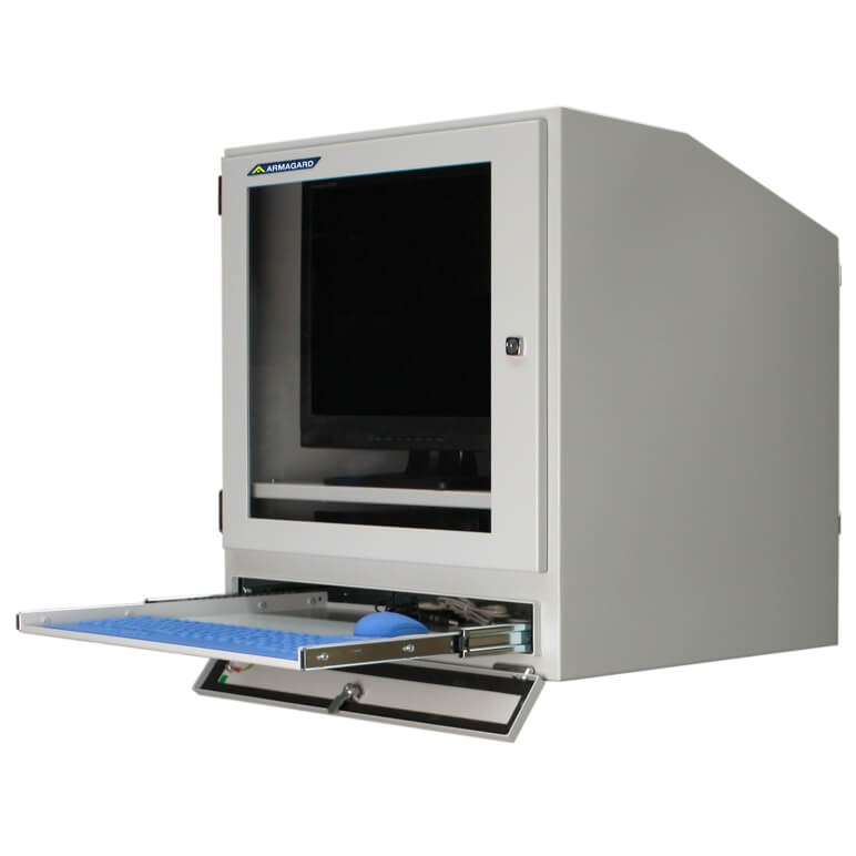 The 800 series computer enclosure is an all-in-one compact computer enclosure designed for protecting a wide range of desktop PC's and displays (CRT and TFT - up to 19"). This IP 54 computer cabinet is manufactured from powder coated mild steel with a sliding, lock-away keyboard tray.