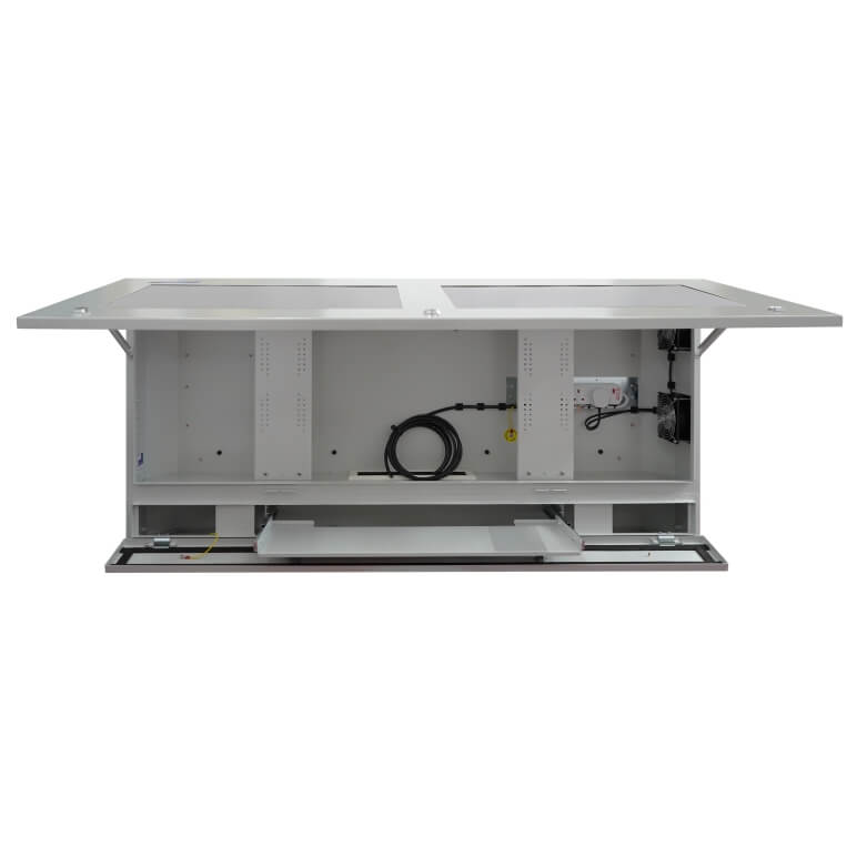 | Shatterproof Polycarbonate Window | Durable polycarbonate window protects the monitors from impact and damage. In the rare event of breakage, it won’t shatter into fragments, helping to maintain a safe working environment. |